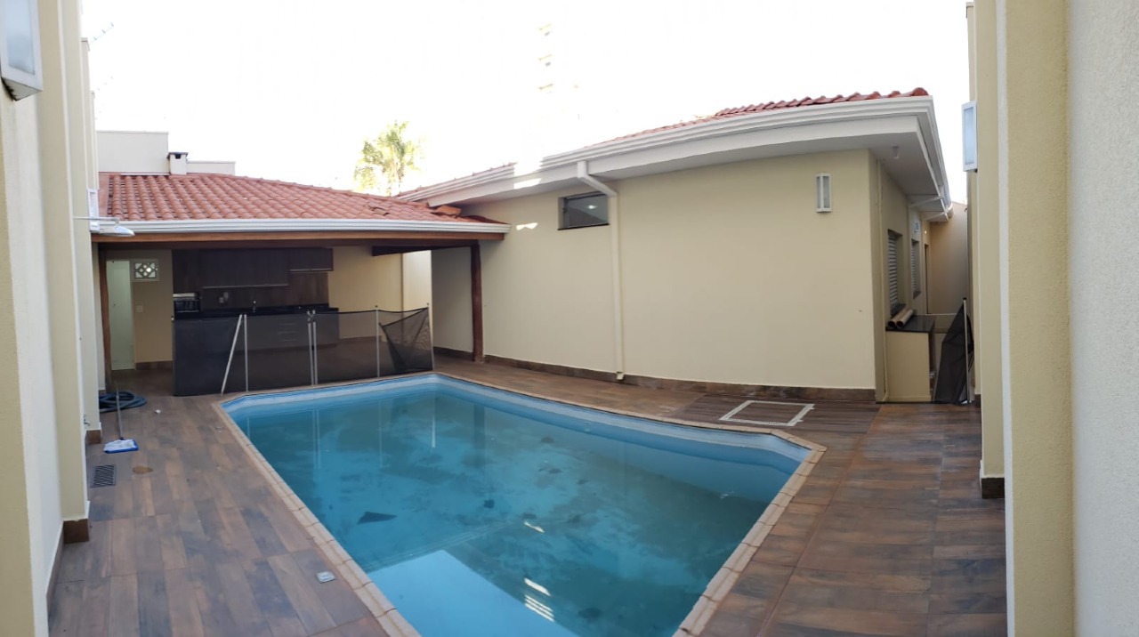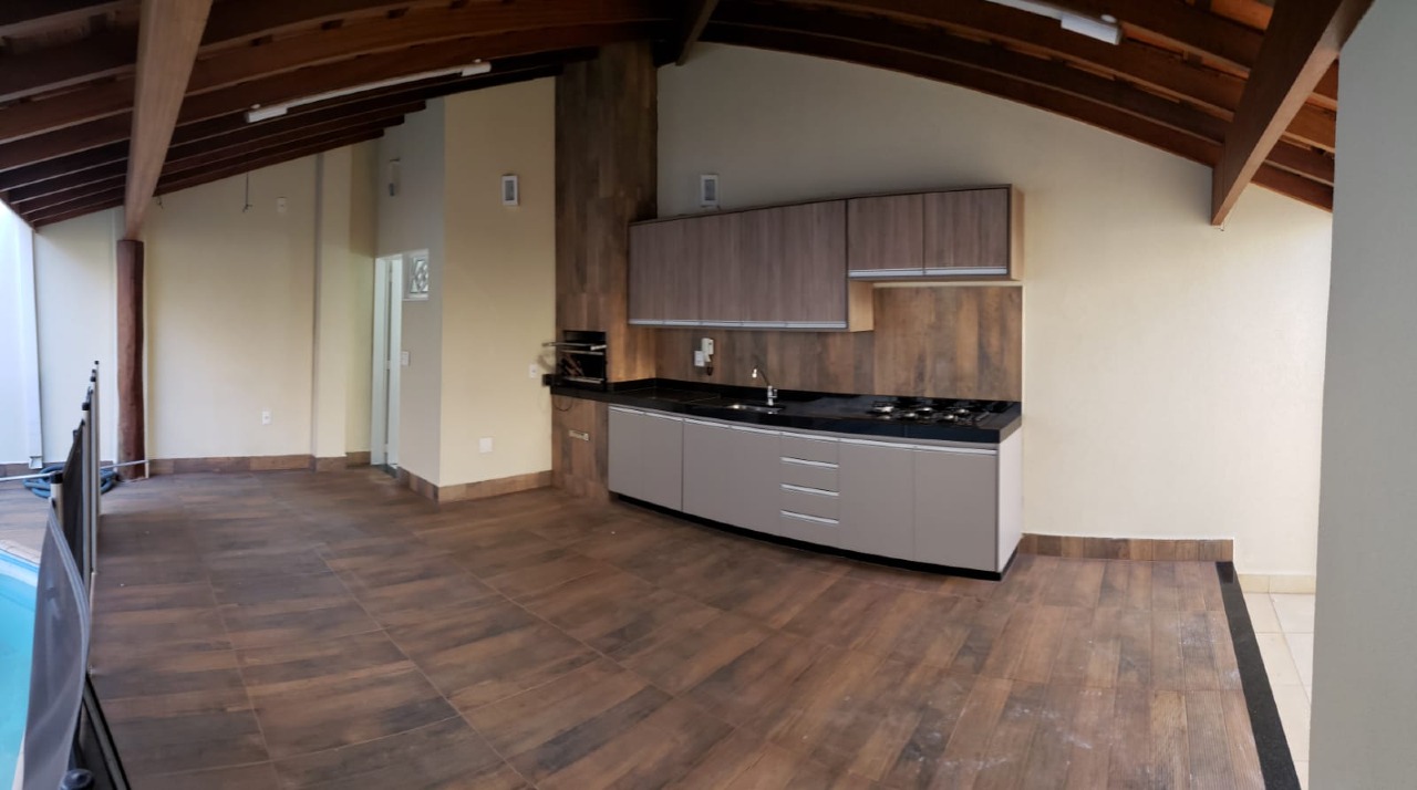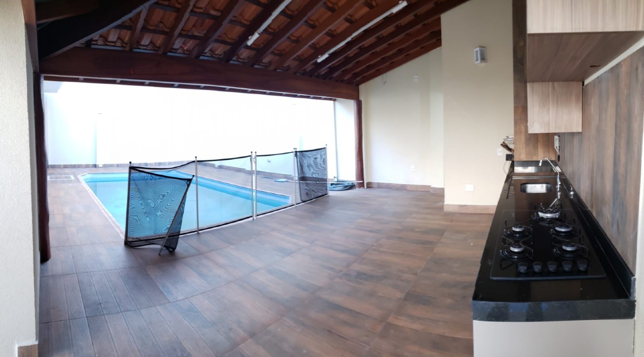 *área de lazer completa com churrasqueira, armários, piscina e lavabo.